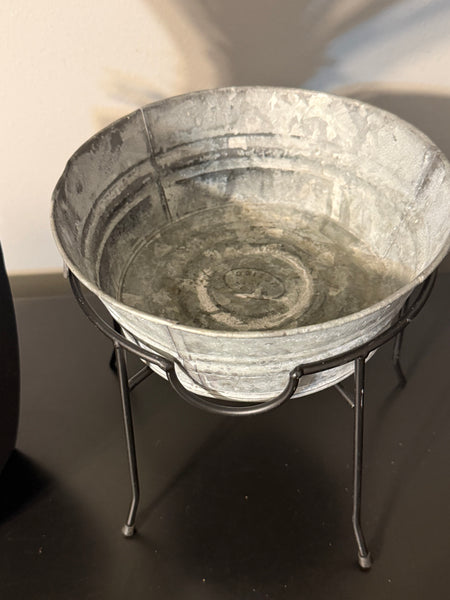 This rustic/farmhouse container measures approx. 9" t (from the base of the stand), the tub is 3 1/2" t x 8" diam.